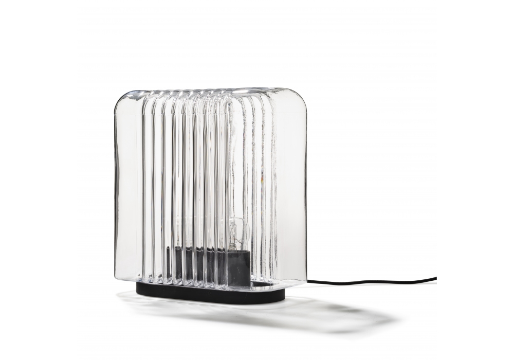 Lari designed by Angelo Mangiarotti for Karakter is a table lamp made with mouth blown glass lampshade, black powder coated aluminum base and black woven fabric cable with dimmer.