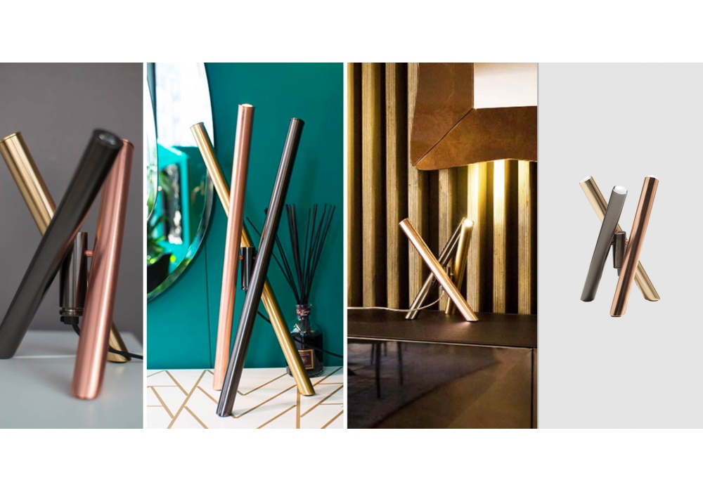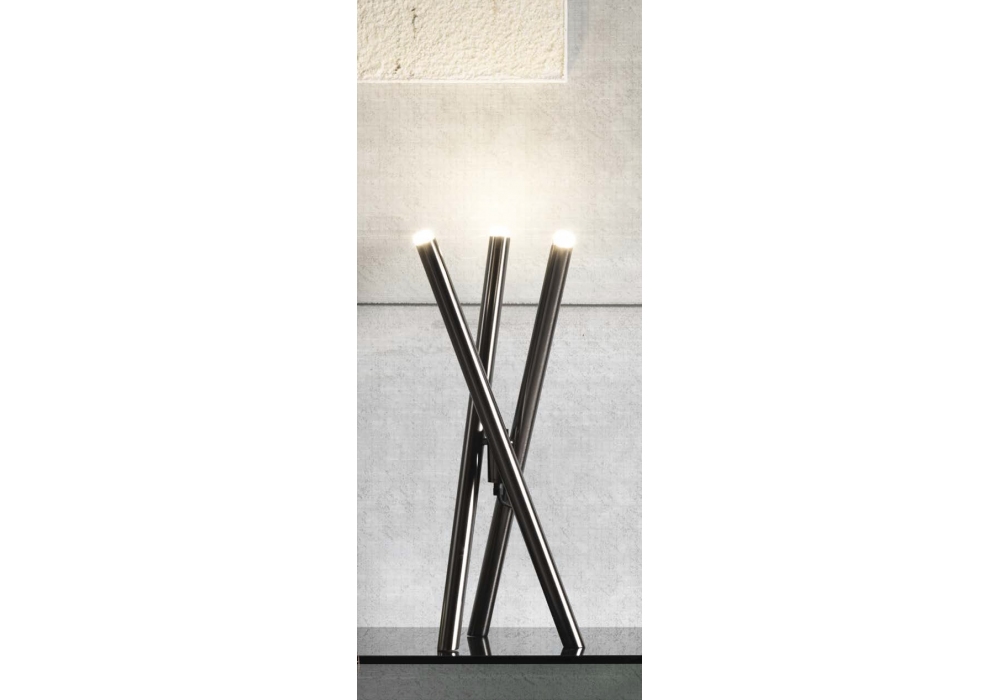 Shangai T designed by Riflessi is a table lamp composed of three metal tubes painted with galvanic satin treatment. Electric cable in black fabric. Available in different finishes.