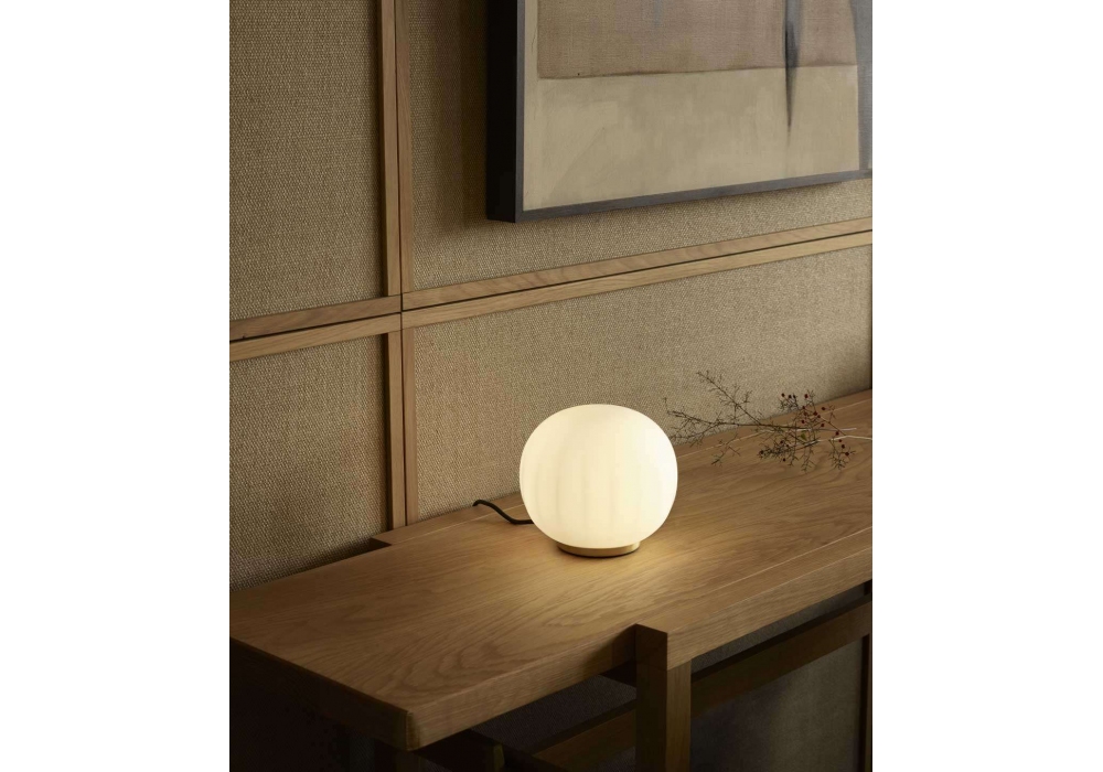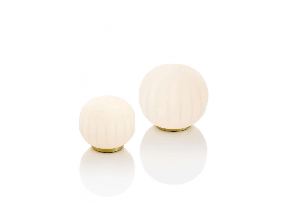 Lita designed by David Dolcini for Luceplan is a spherical table lamp with structure in matt white or brass painted aluminum and opal white blown glass diffuser. Available in different dimensions.
