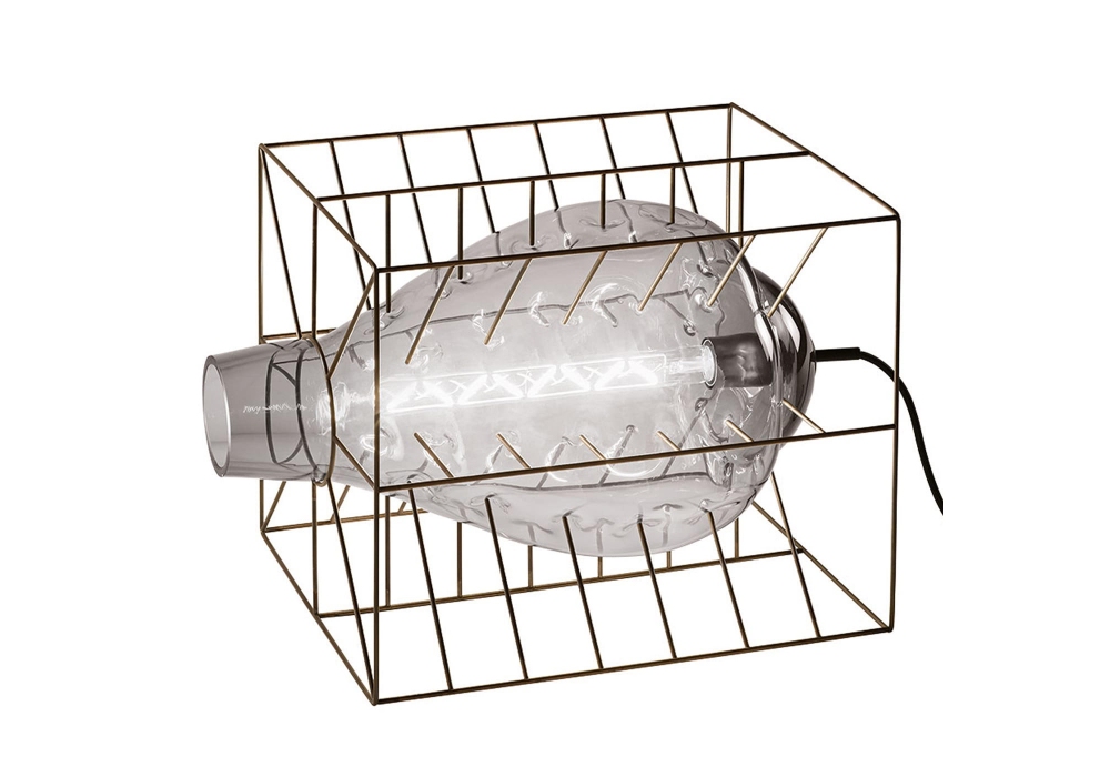 Attimo designed by Domenico Rinaldi for Fisionarte is a table lamp structured by a cage in raw steel and glass. The diffuser has a rounded shape in Murano glass and houses a light source with E27 insert powered by a black textile fiber cable. Attimo is available in different glass finishes and with or without LED lamp.
