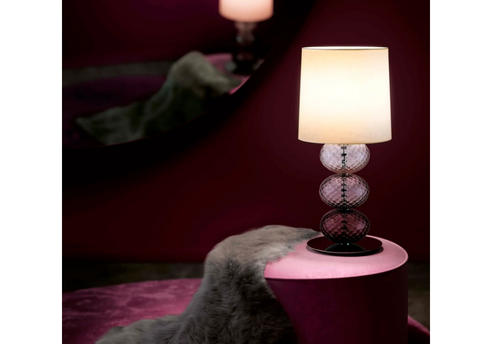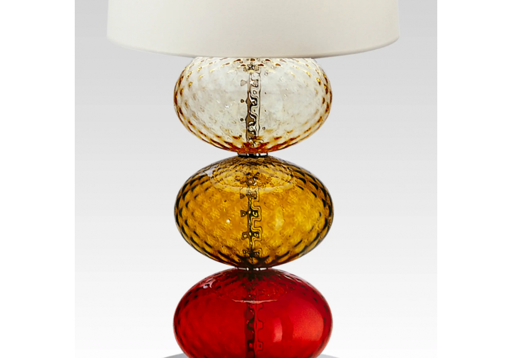 Abat-Jour 803.00 designed and produced by Venini is a table lamp with white fabric lampshade and chromed metal structure, embellished with 3 blown glass beads with balloton processing. Available in 2 color combinations.