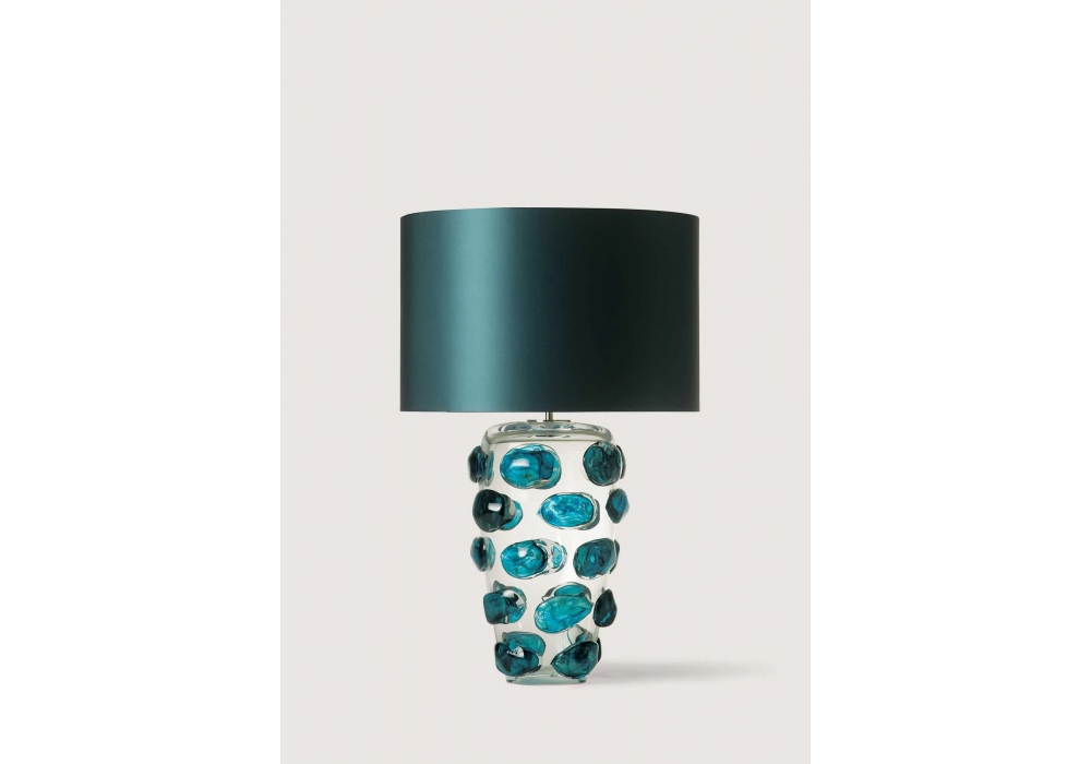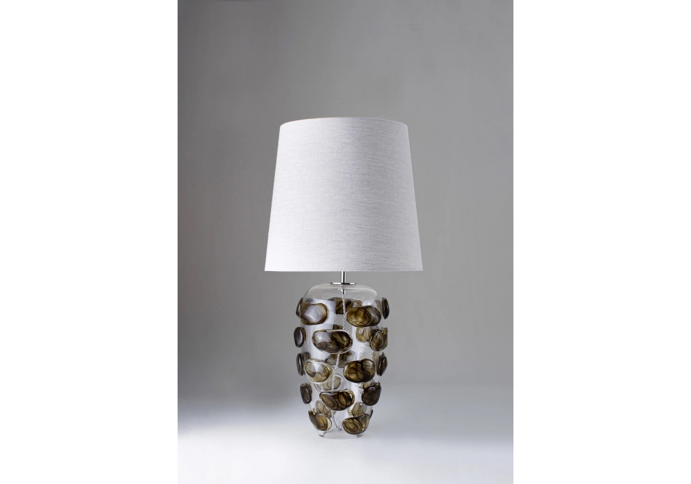 Blob designed and produced by Porta Romana is a structured table lamp in blown glass with molded glass applications and plated metal details. The lampshade is in fabric and screens a light source with an E27 socket of the LED type powered by a textile fiber cable. Blob is available in different finishes for each single element.