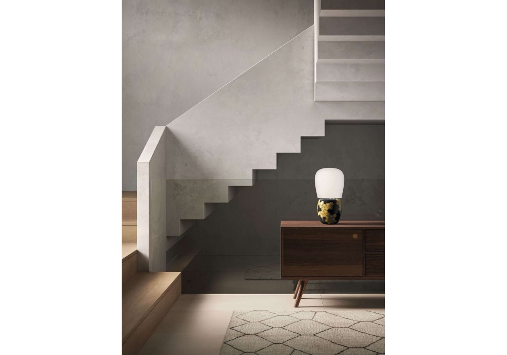 Hive designed by Ini Archibong for Kundalini is a table lamp with diffuser in layered and blown opal glass. Body in glazed ceramic decorated with the "third fire" technique. Available in different finishes.