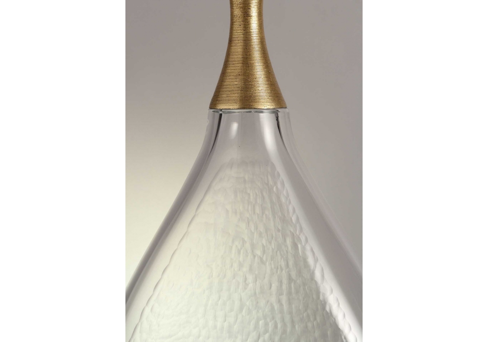 Droplet designed and produced by Porta Romana is a structured table lamp in transparent blown glass with painted metal details. The lampshade is in fabric and screens a light source with an E27 socket of the LED type powered by a textile fiber cable. Droplet is available with a wavy or smooth lampshade, and in different finishes for each single element.