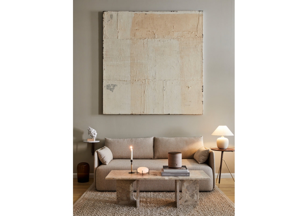 Torso 37 designed by Krøyer-Sætter-Lassen for Audo Copenhagen is a table lamp with white ceramic base and linen shade in sand finish.