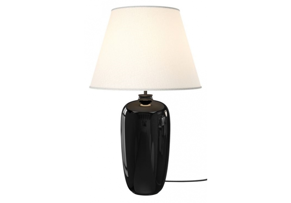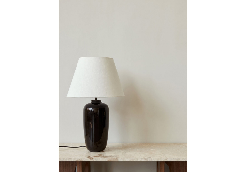 Torso 57 designed by Krøyer-Sætter-Lassen for Audo Copenhagen is a table lamp with black ceramic base, linen shade in white finish.