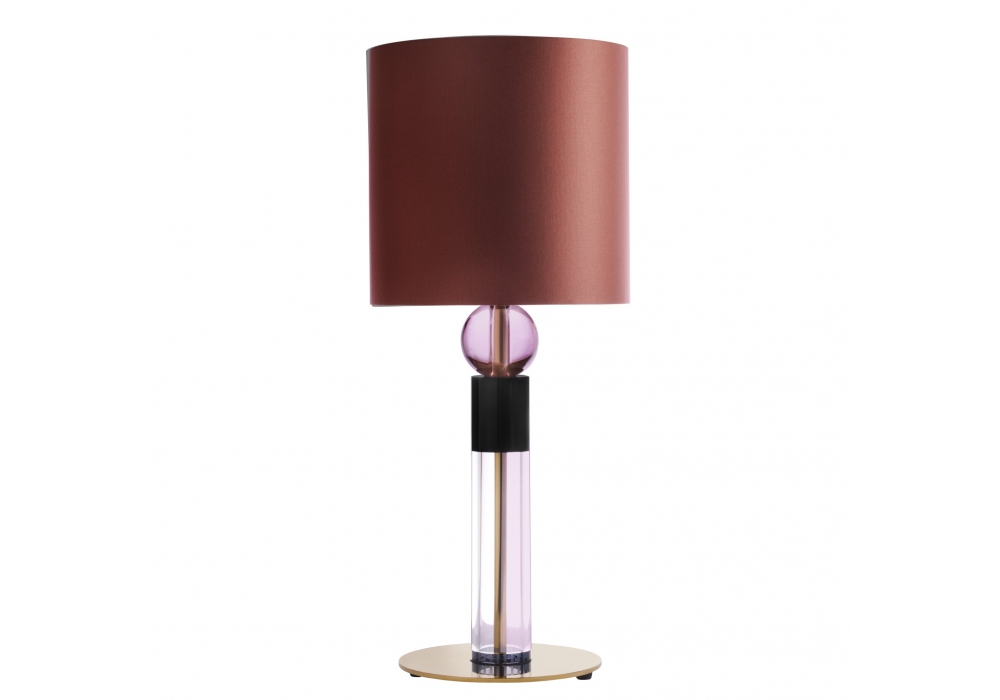Carnival NO. 2 designed by Design By Us for Reflections Copenhagen is a table lamp with supporting structure in metal covered in brass and dark pink tubular crystal. The lampshade is cylindrical in shape covered in linen and shields a LED-type light source with E27 socket.