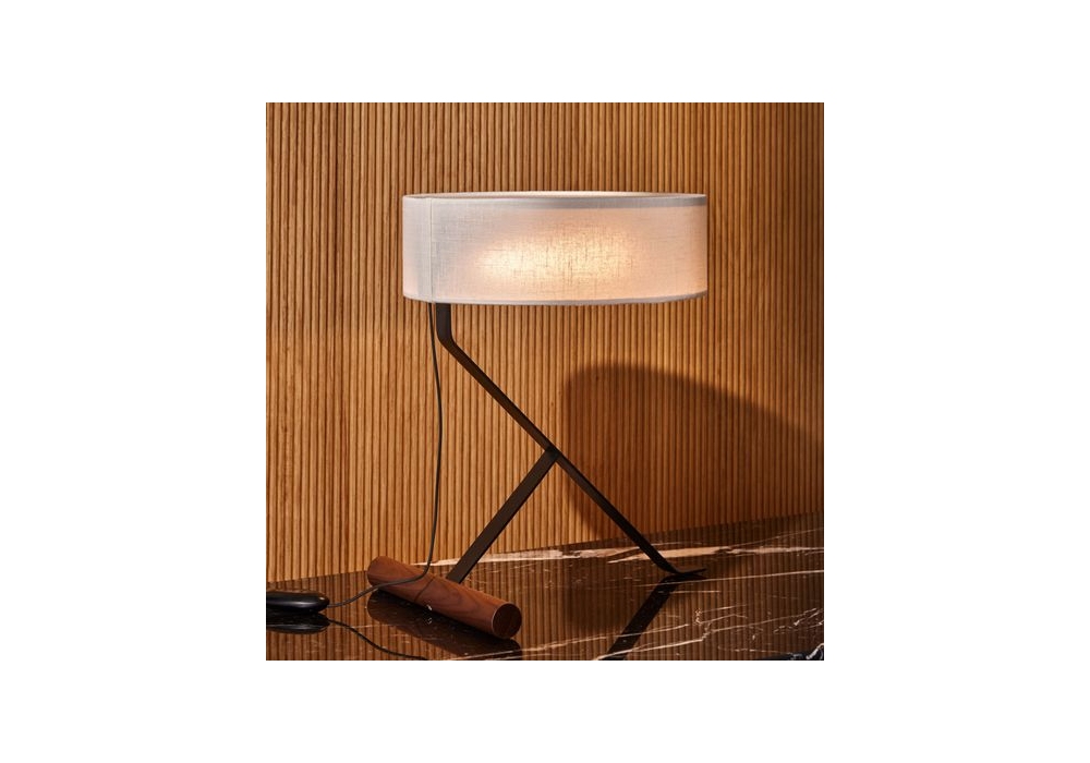 Chicago designed by Norm Architects for Punt is a table lamp with structure in black metal with base in natural walnut wood. Diffuser in acrylic and lampshade in natural cotton fabric. Black cable with dimmer.