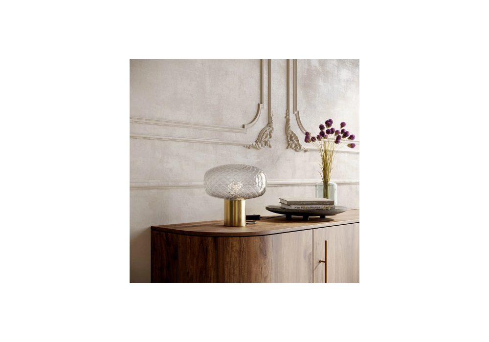 Bloom designed by Matteo Zorzenoni for Il Fanale is a table lamp with cylindrical base in natural brass. The diffuser is circular in shape and made of textured glass and shields an LED light source. Bloom is available in different models and finishes.