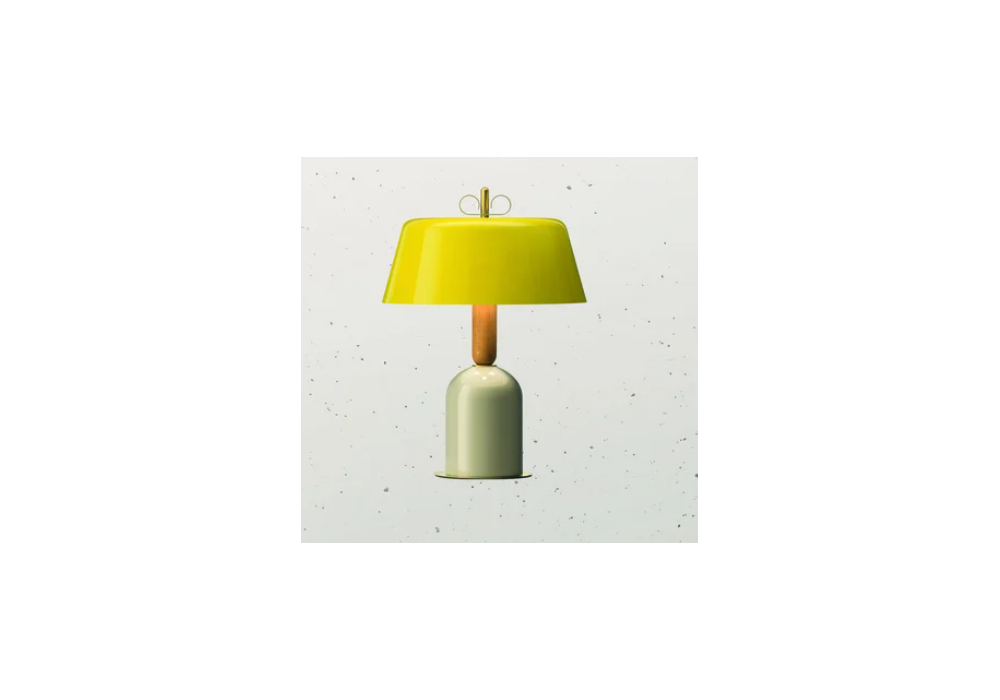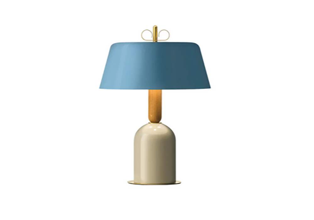 Bon Ton N6 designed by Cristina Celestino for Il Fanale is a table lamp with a cylindrical base in painted aluminum and a vertical rod in brass embellished with oak details. The diffuser is circular in shape in painted aluminum and shields an LED light source. Bon Ton N6 is available in different finishes.