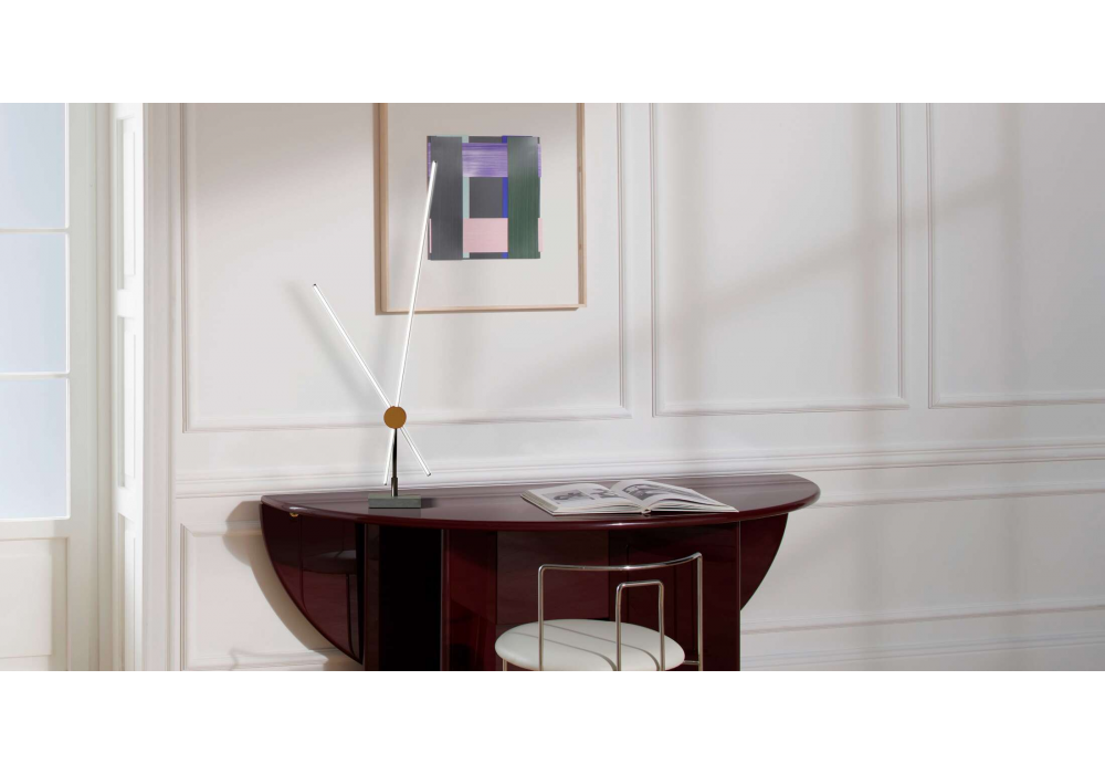 EITIE Table designed by Tobia Scarpa for Cassina is a table lamp made of aluminum and PC, with lacquered metal joint in different finishes. Composed of two LED strips and a Serena stone base.