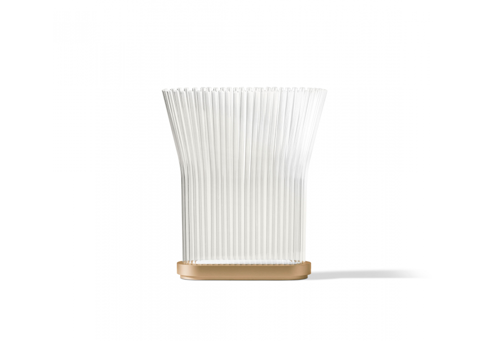 Fluxus-E Oval designed by Paolo Ulian for Cassina is a table lamp made with borosilicate glass stems, natural or champagne aluminum base and PMMA diffuser.