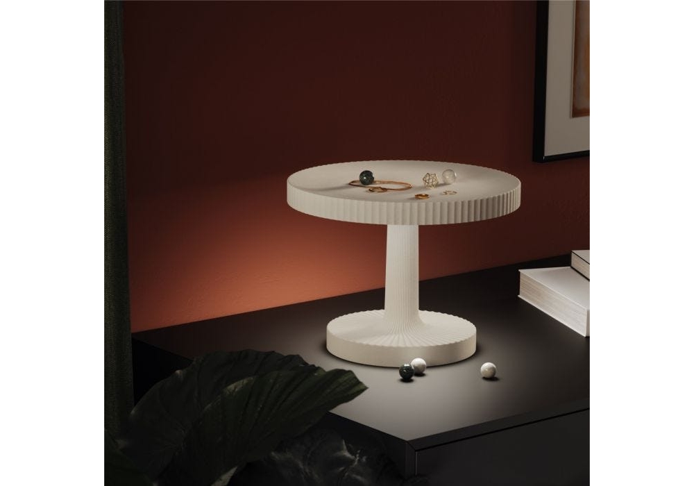 Welcome designed by Fabio Novembre for Driade is a table lamp with direct LED light, which can also be used as a centrepiece. Made of batch-dyed ABS plastic material, the diffuser is in transparent opal white PMMA. A transparent touch button allows the light to be switched on, off and adjusted as well as indicating the charge level. The lamp is powered by an 8-hour battery and rechargeable via a cable with a USB socket. Indoor/outdoor use.