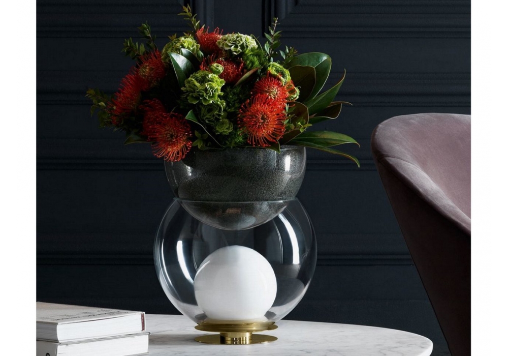 Giova designed by Gae Aulenti for Fontana Arte is a non-dimmable table lamp giving diffused light with structure in chromed or galvanized metal with central sphere in transparent blown glass. Internal sphere in glossy white blown glass. Upper hemisphere in colored transparent pulegoso blown glass. Black power cord, switch and plug. Available in different sizes and finishes.