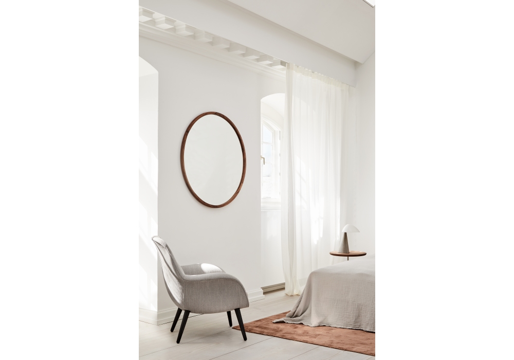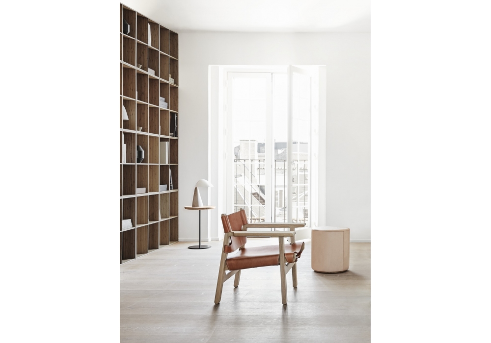 Fellow designed by Space Copenhagen for Fredericia is an LED table lamp made with a dark Atlantic limestone base and a powder-coated steel lampshade that can rotate a maximum of 150 degrees on each side from the central position. Black fabric power cord with on/off switch. Solid brass details.