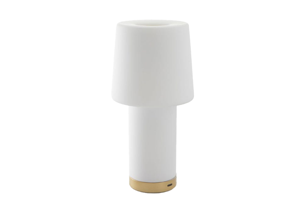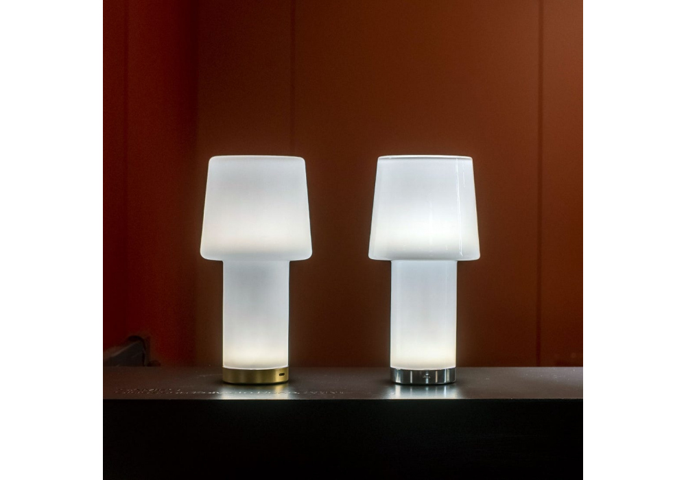 Cameo designed by Claesson Koivisto Rune for Fontana Arte is a rechargeable table lamp made of satin blown glass combined with a metal frame painted in satin gold or chromed metal. The decorative metal circle, positioned on the diffuser, is made of the same material and finish as the base and features the silk-screened FontanaArte logo. Switching the light on, off and adjusting the intensity is done via a transparent touch button. Cable with USB plug included in the package.