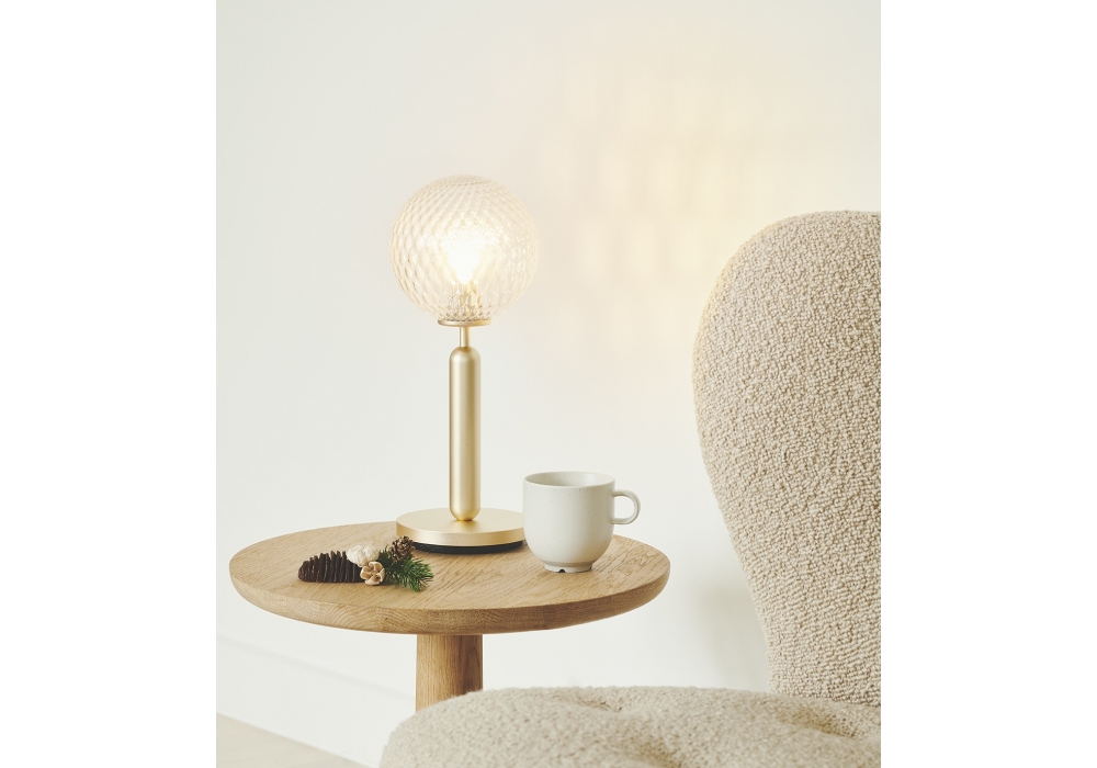 Miira designed by Sofie Refer for Nuura is a table lamp with structure in worked metal and diffuser in mouth-blown or transparent opal glass with a relief pattern.