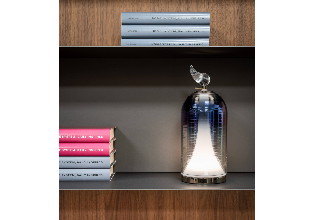 Munetta designed by Danilo De Rossi for Italamp is a compact cordless table lamp with 8 hours of autonomy. Diffuser in ribbed blown glass with shaded blue finish and metal structure with gunmetal finish. Crystal detail. Touch sensor for adjustment. USB power cable included.