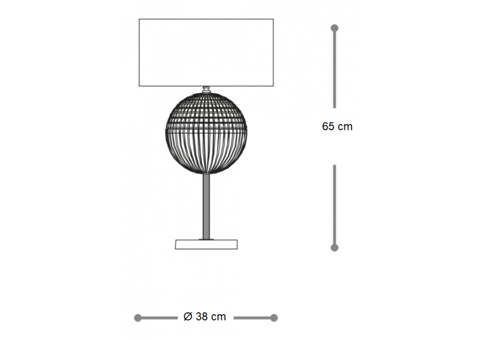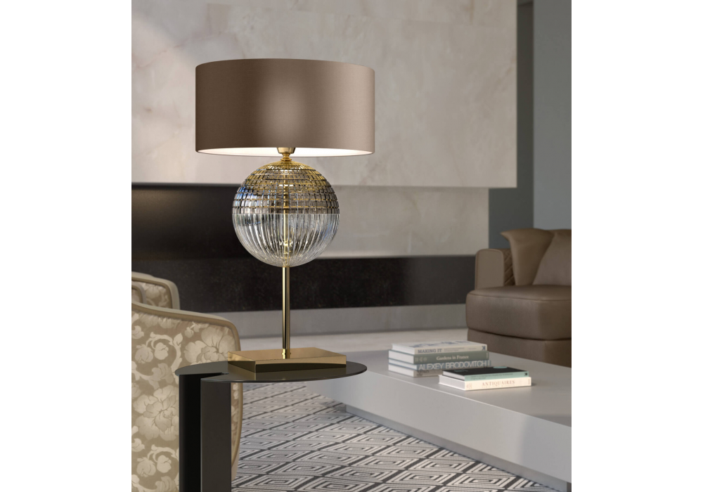Brigitta designed and produced by Italamp is a table lamp with nickel gold metal structure, spherical body in transparent carved crystal and teak with fabric diffuser in dove gray finish.