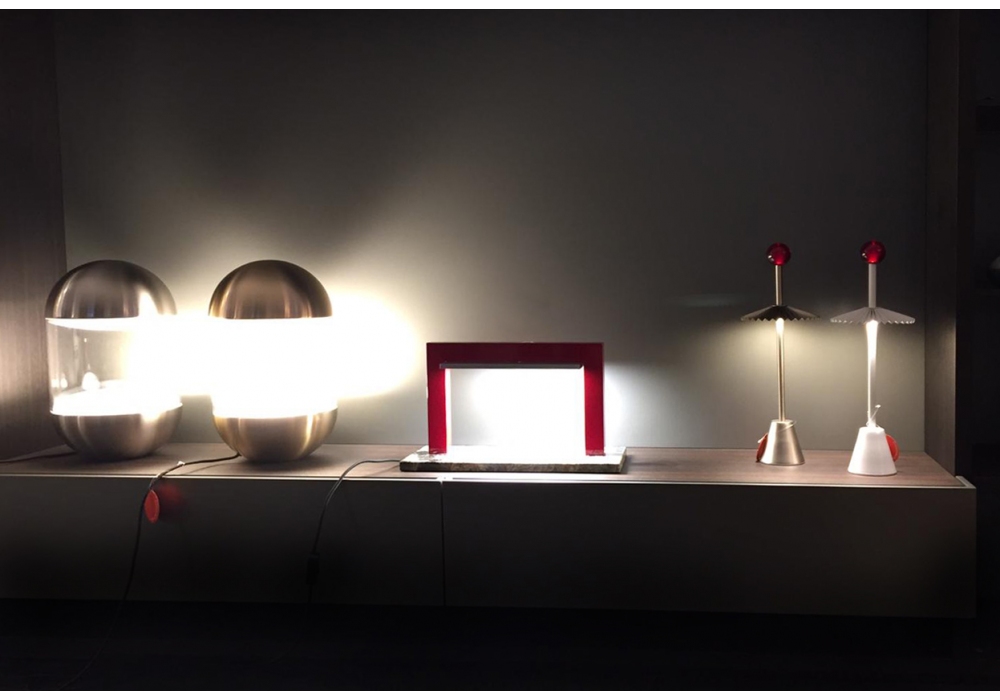 Trilite designed by Franco Raggi for Firmamento Milano is a table lamp with direct light made with a marble base and lacquered wood support. Polished aluminum diffuser. Available in different finishes.