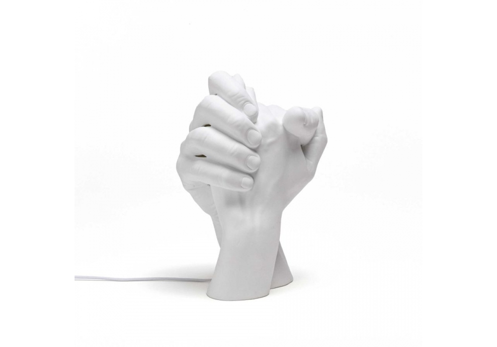 Whit Me designed by Marcantonio for Seletti is a table lamp entirely made of white porcelain which represents the union of two hands. The light source adopted is LED type.
