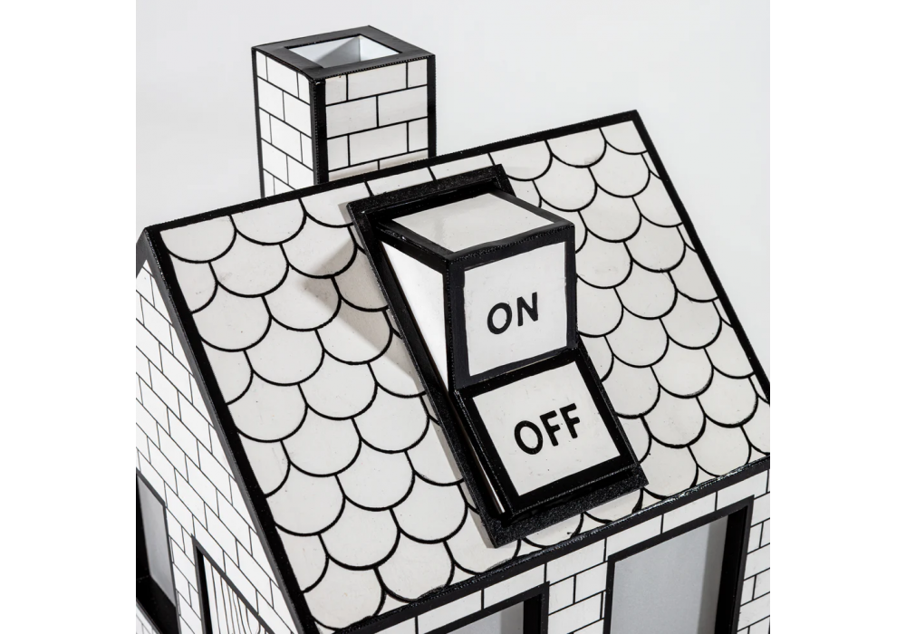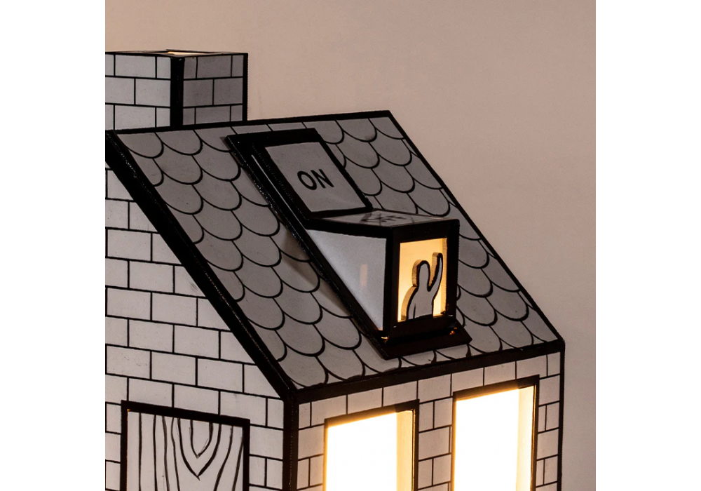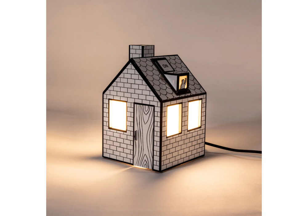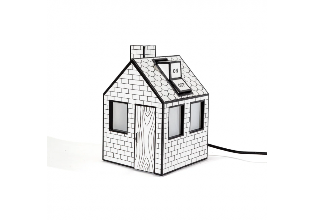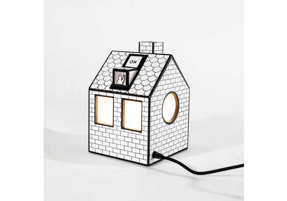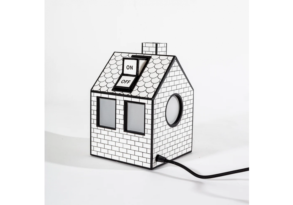 On-Off designed by Tomas Schats for Seletti is a table lamp that represents a small brick house entirely made of black and white recycled paper. The light source adopted is LED type powered by a white plastic cable.