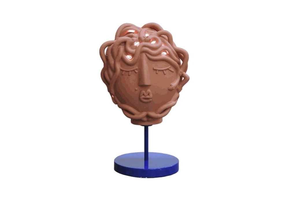 Maschera Medusa designed by Antonio Aricò for Seletti is a table lamp with circular base and vertical rod in blue painted metal. The upper part represents the face of a woman and is made entirely of terracotta.