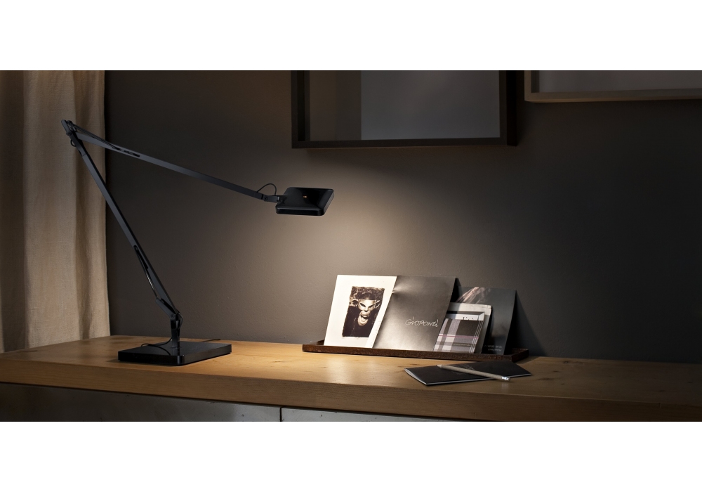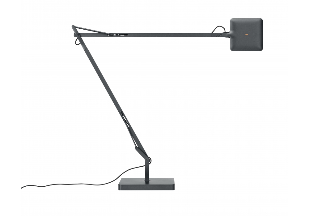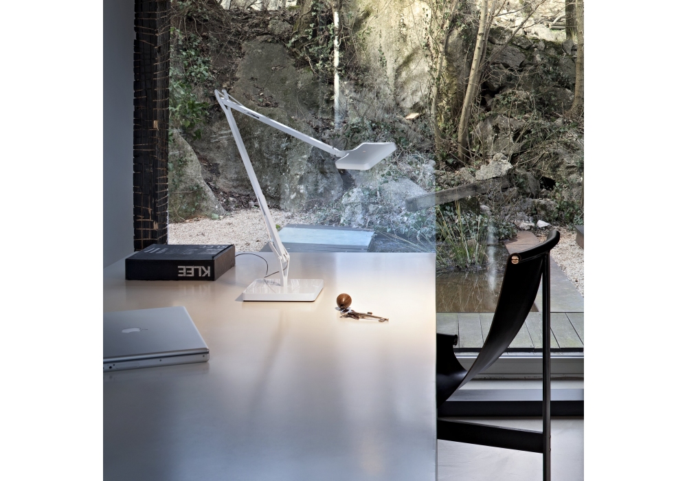 Kelvin LED designed by Antonio Citterio & Toan Nguyen for Flos is a direct light table lamp with double pantograph arm and adjustable head. Body in cast aluminum alloy. External head in die-cast aluminum with injection-molded methacrylate diffuser. External BASE covering in ABS. Structure obtained from a square tube in extruded aluminum alloy mechanically worked to allow the housing and sliding inside it of the stainless steel compensation springs and the injection-molded acetal resin sliders. The external tie rods are in steel wire. The ON/OFF switch is electronic and is equipped with optical operation housed in the head.