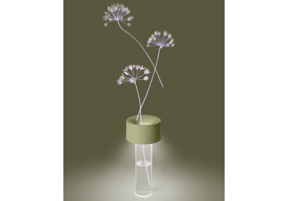 Fleur designed by Rodolfo Dordoni for Foscarini is a portable table lamp/flower vase structured by the combination of borosilicate glass, ABS and PMMA. The base is cylindrical in glass and supports a colored ABS lampshade. The diffuser is made of polycarbonate and shields an LED light source with a Touch dimmability system. Fleur is available in different finishes.