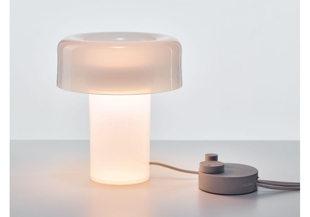 Spectra Mini designed by Lucie Koldova for Brokis is a table lamp made of polished blown glass in different finishes. The light source used is a dimmable LED type. The lamp body is in silver or anodized black to match the dimmer.