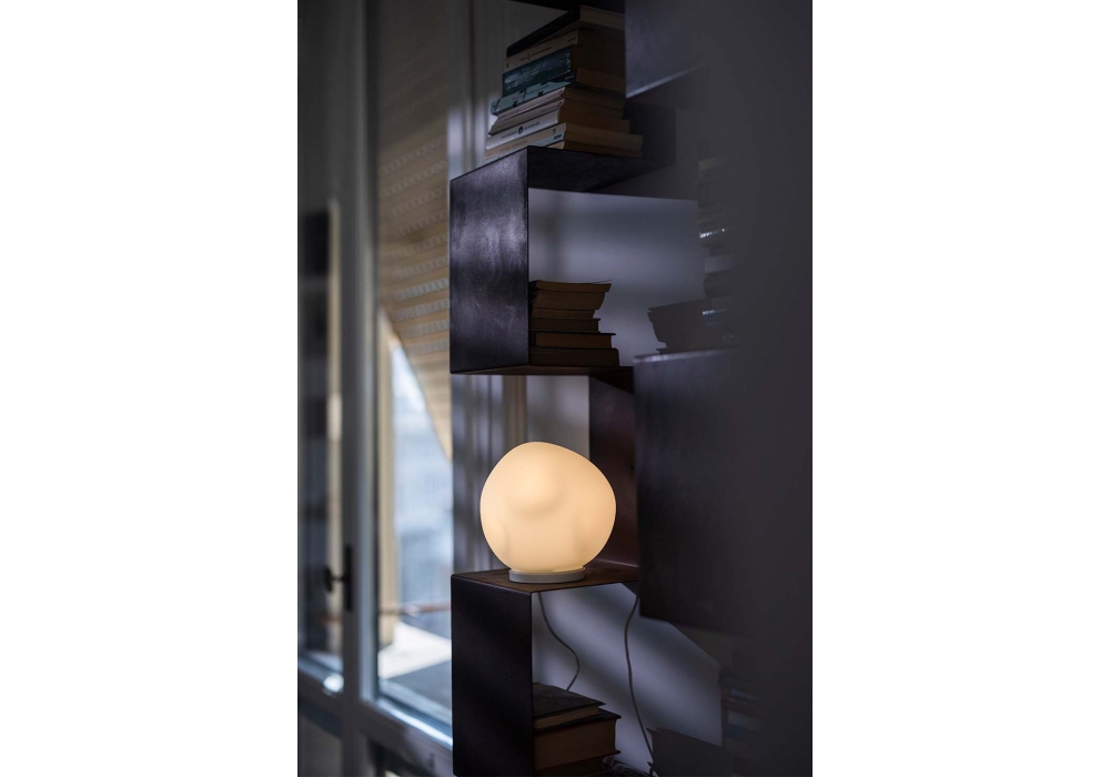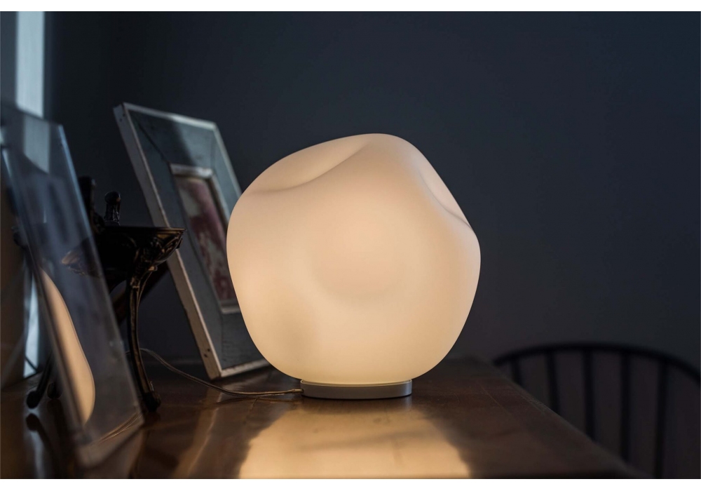 Hoba designed by Ludovica and Roberto Palomba for Foscarini is a table lamp inspired by the shape of a meteorite, asymmetrical in opaque blown glass. Available in different dimensions.