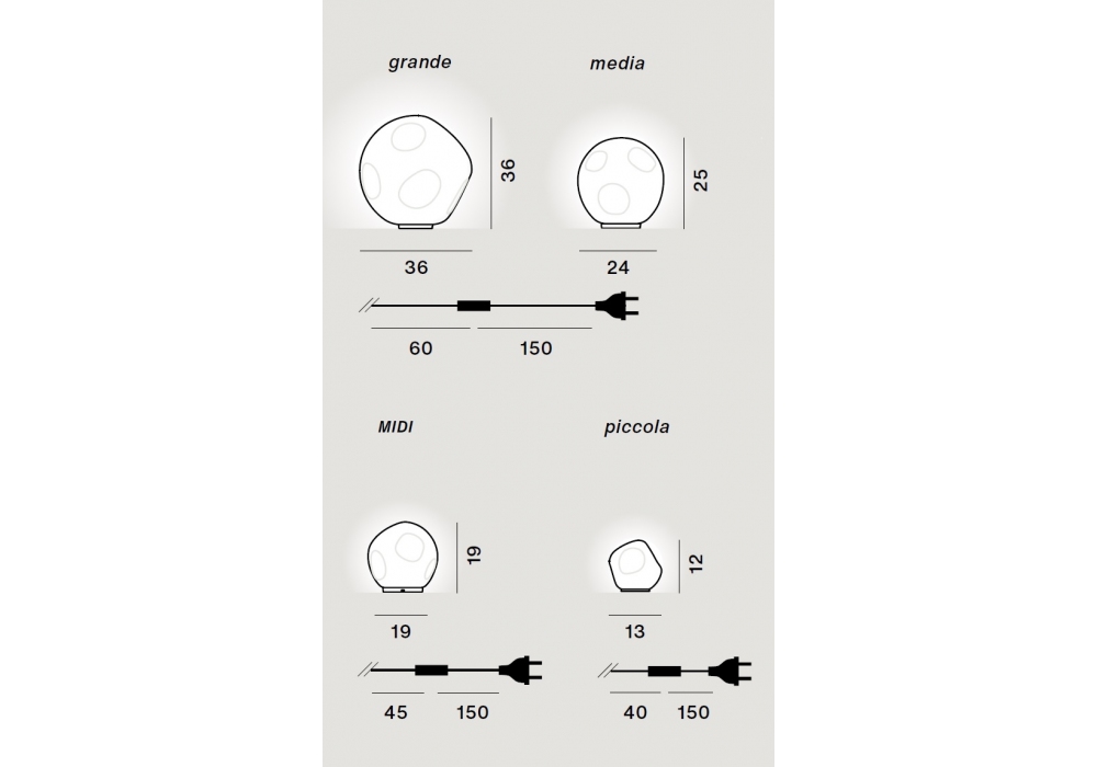 | Dimensions | Ø 36 x H 36 cm; Ø 24 x H 25 cm; Ø 19 x H 19 cm; Ø 13 x H 12 cm. |