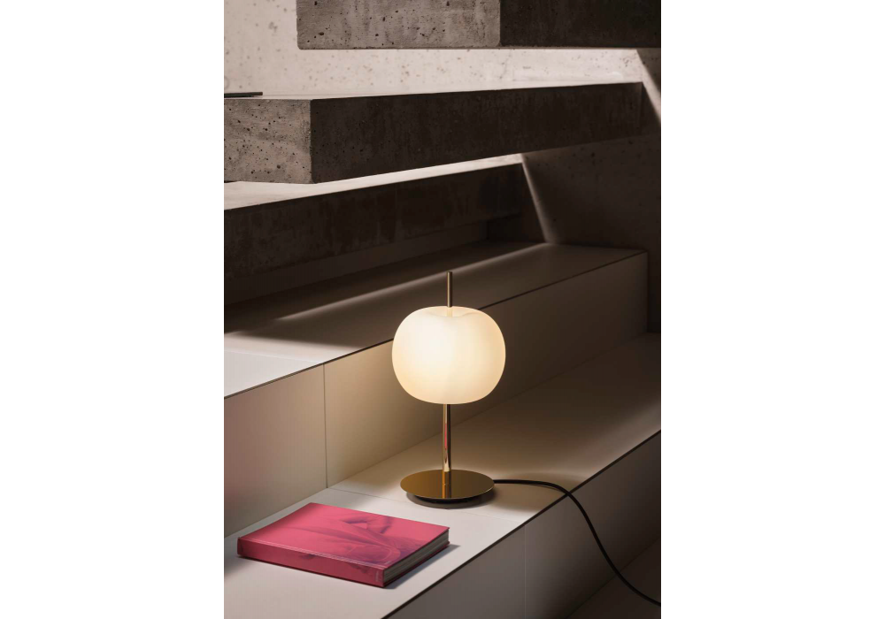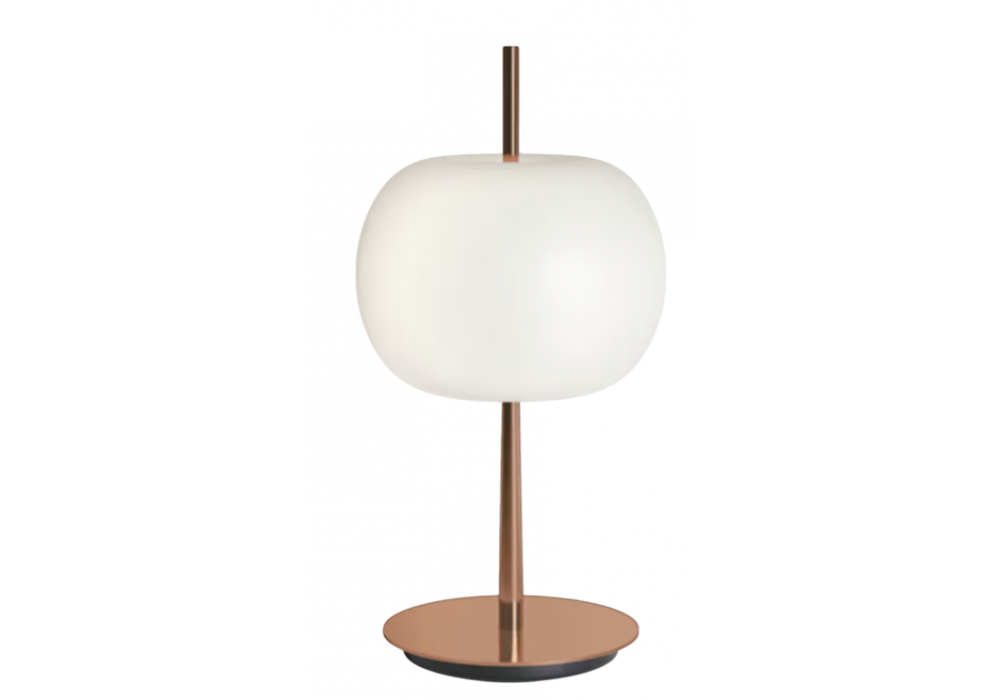 Kushi 10th designed by Alberto Saggia & Valerio Sommella for Kundalini is a table lamp with a diffuser in opal blown glass and a painted metal structure in black, copper and brass finishes. It is possible to choose the color and intensity of the lacue via dimmer.