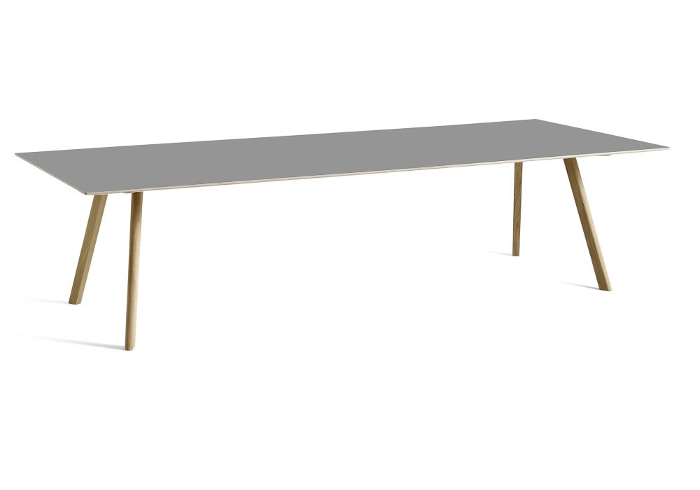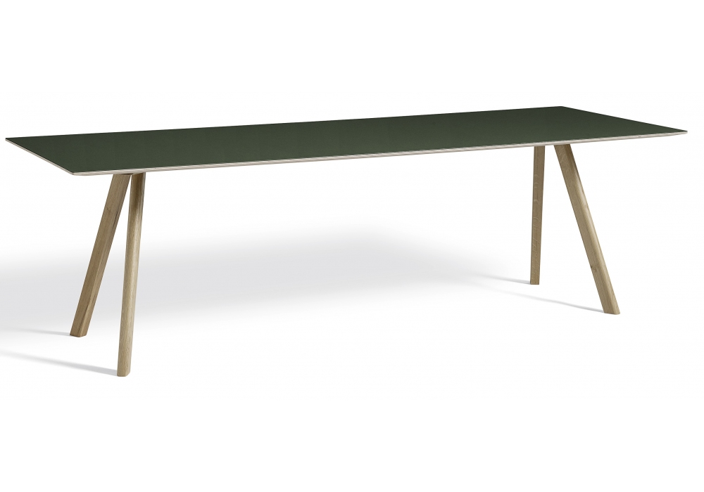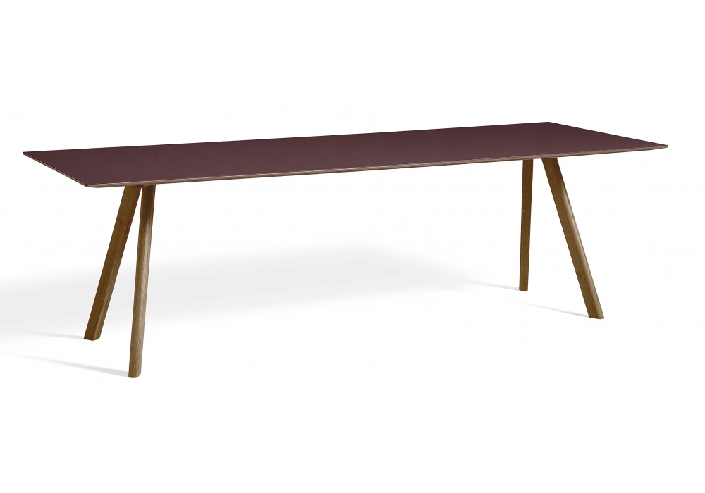 Copenhague CPH 30 designed by Ronan and Erwan Bouroullec for Hay is a table with plywood top with laminate, linoleum or veneer in different finishes. The edge of the table top is bevelled and matches the finish of the base. Inclined wooden legs fitted with invisible integrated screws. Extendable adjustable feet to level the table on uneven surfaces. Available in different dimensions and finishes.