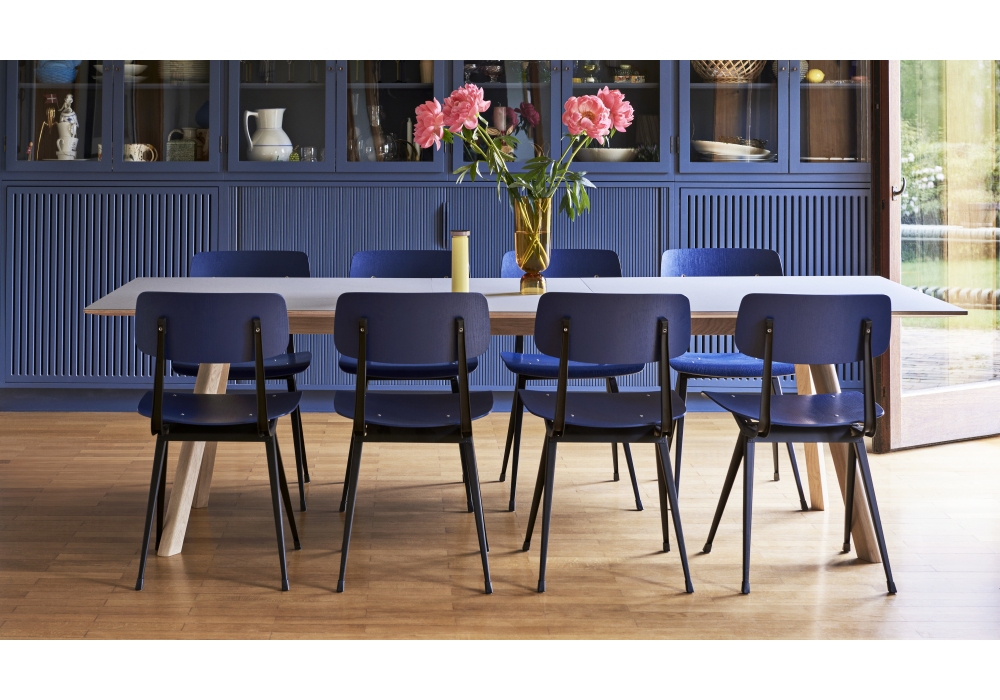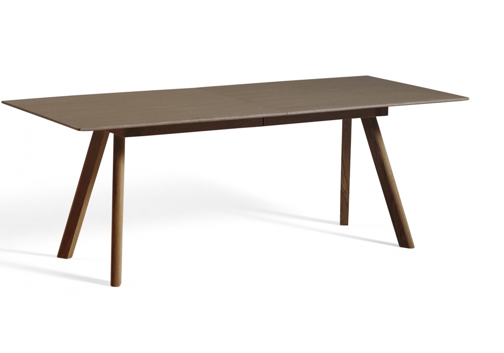 Copenhague CPH 30 designed by Ronan and Erwan Bouroullec for Hay is an extendable table with top in plywood with laminate, linoleum or veneer in different finishes. The edge of the table top matches the finish of the frame. Inclined solid wood legs with integrated invisible screw connection and extendable adjustable feet for leveling the table on uneven surfaces. Available in different dimensions and finishes.
