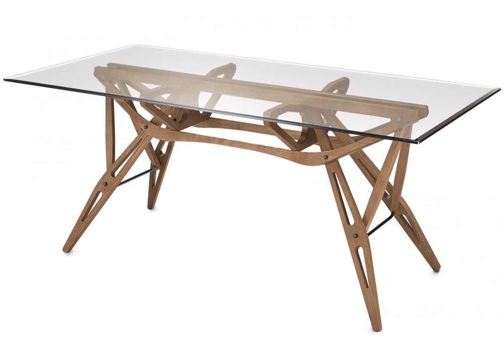 2320 Reale designed by Carlo Mollino for Zanotta is a table with transparent glass top with or without bevelled edges or in Emperador marble, with protective stain-resistant varnish. Structure in natural, walnut Canaletto or black stained oak. Available in different dimensions.