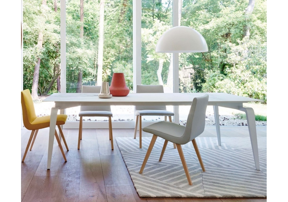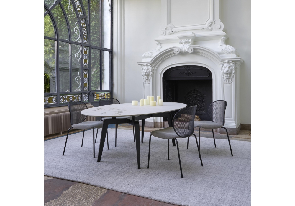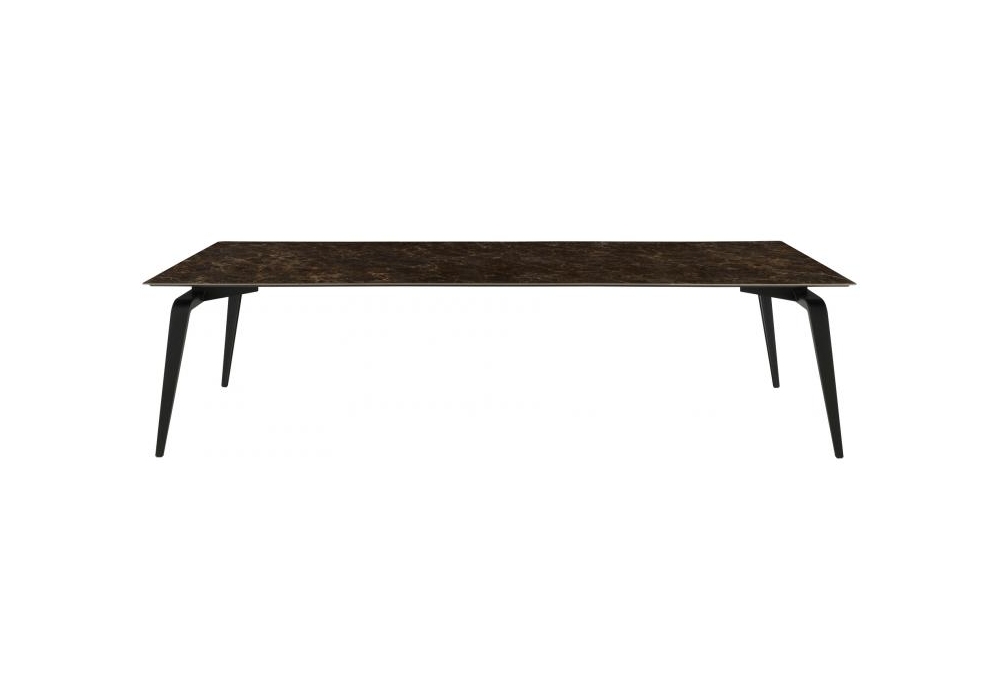 Odessa designed by Mauro Lipparini for Ligne Roset is a dining table with folded steel base. The top is in ceramic stoneware (6 mm thick). The visual finesse of which contrasts with the robustness of the base, is glued onto a generous steel structure which incorporates a plate to which the legs are fixed. This structure is barely visible since it is set back 12 cm in comparison to the top. Two elegant aluminium profiles, lacquered to match the base, link the legs along the entire length of the top.