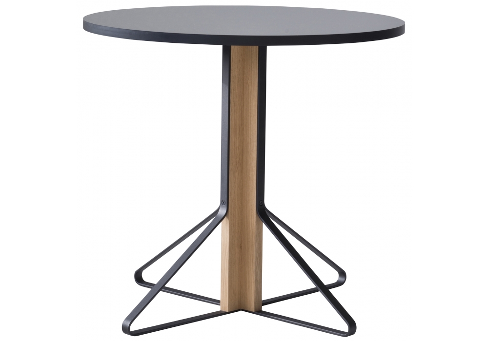 Kaari Table, designed by Ronan & Erwan Bouroullec for Artek, is a round table available in different dimensions. Tabletop with linoleum or HPL high gloss surface (thickness approx. 24 mm). Base solid natural oak with protective varnish or black stained with protective varnish, flat-rolled steel powder-coated black.