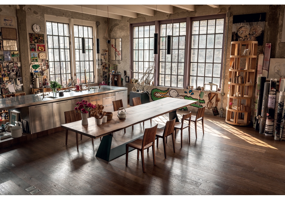 Bedrock Plank C designed by Terry Dwan for Riva 1920 is a table with top made of solid wood, composed of two single aligned boards with central joint and natural edges. Base in iron sheet characterized by geometric lines.