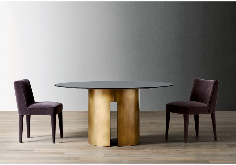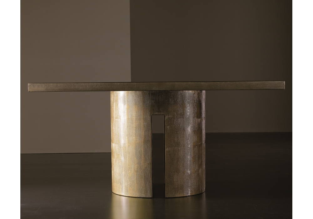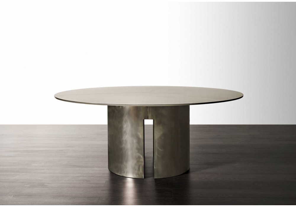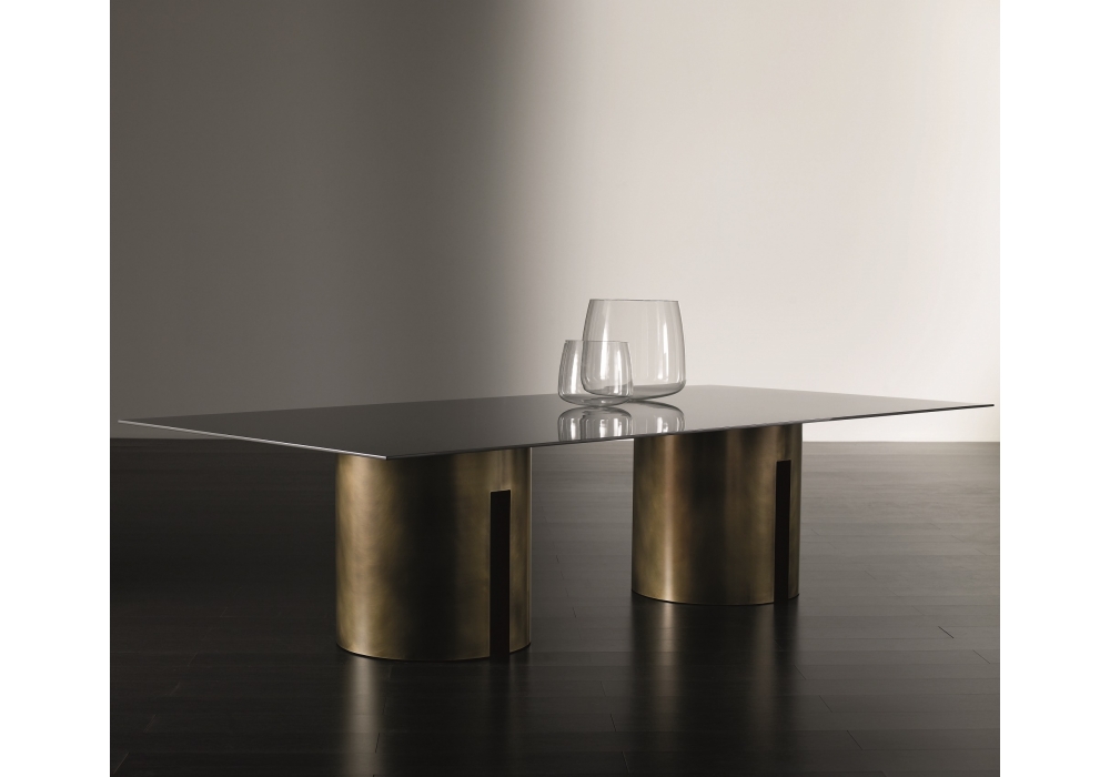 Gong designed by Andrea Parisio for Meridiani is a tables collection with base available in bronzed brass and platinum steel (inner part matt black varnished). Table top available in resin, stained oak veneer, matt or glossy lacquered, back-painted glass, marble.