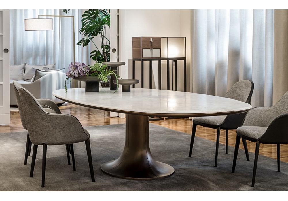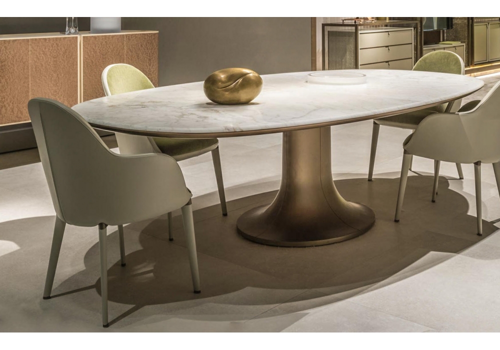 Mizar designed by Roberto Lazzeroni for Giorgetti is an oval or round table, with base in cast bronze. Top available in gold calacatta marble, Portoro, Zebrino and Velvet Brown, with bronze-colored painted edges with natural effect. The Mizar top is available divided into four parts with a mirror effect or with a single slab (only in the oval version).