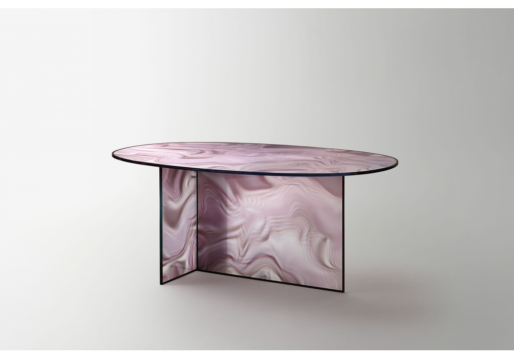 Liquefy designed by Patricia Urquiola for Glas Italia is a table made of tempered transparent extralight crystal, with a decoration that resembles the marble. Thanks to a surprising effect, the veins seems dynamic and variables depending on the observation point. Available in different finishes.