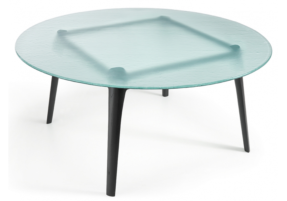 Magma designed by Patrick Jouin for Fiam is a table with 15 mm fused and tempered glass top, back-painted with semi-trasparent finishes or with metallic paints. Solid wood structure available in Tobacco or heat-treated black finish.