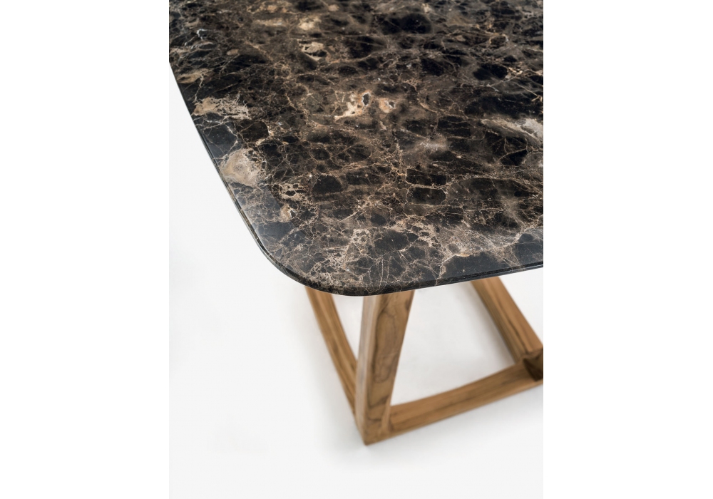 Bungalow Marble designed by Jamie Durie for Riva 1920 is a bar table composed of a completely turned solid wood structure, assembled and sanded by hand, with a square base combined with a marble top with rounded and protruding sides.