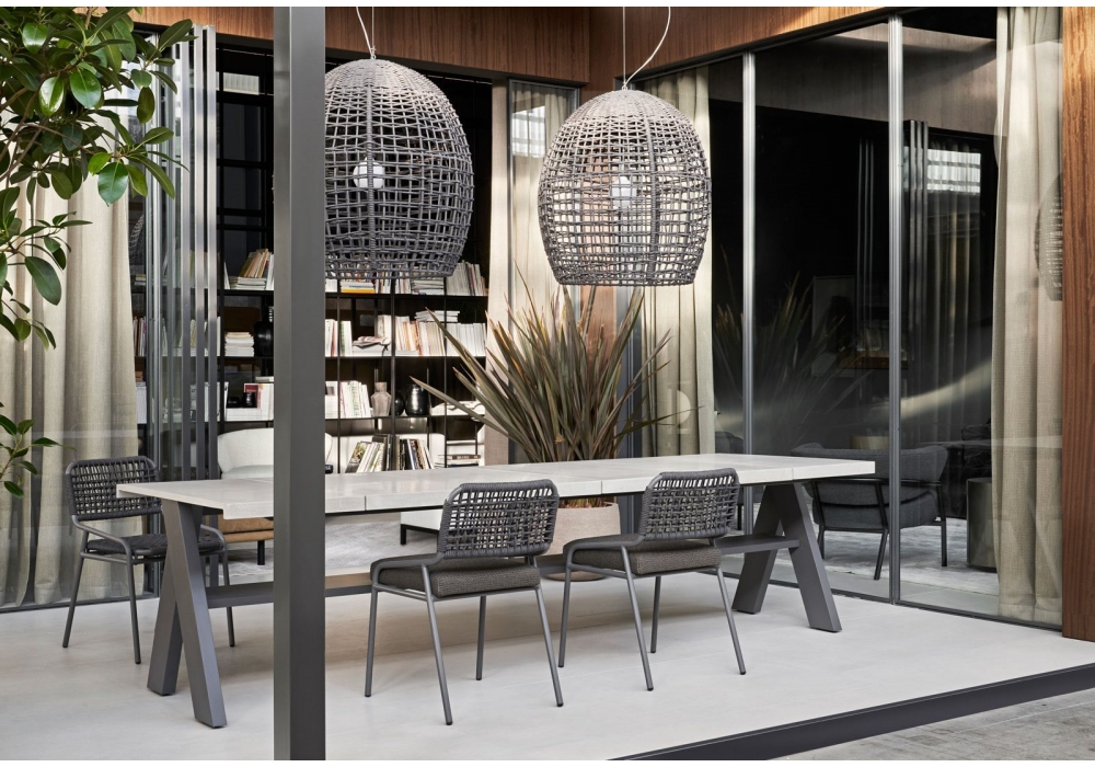 Joi designed by Andrea Parisio for Meridiani is a dining table with legs in solid glossy, matt or iroko lacquered solid wood, shelf in poplar, glossy or iroko lacquered poplar plywood and top in glossy, matt lacquered MDF wood or fiber-reinforced UHPC concrete.