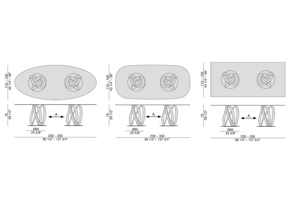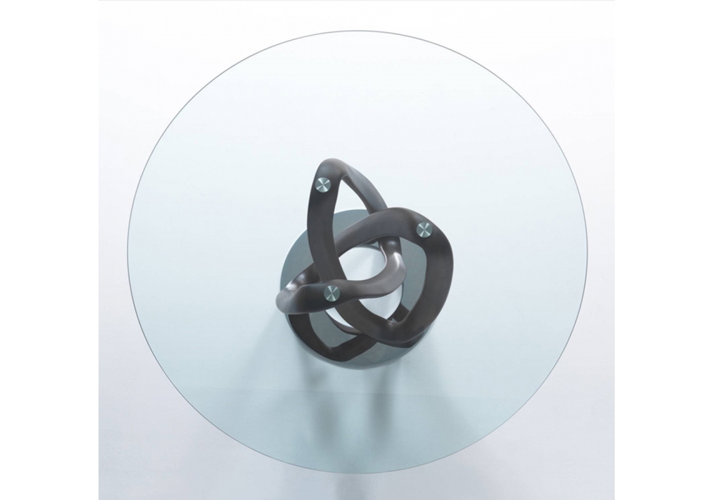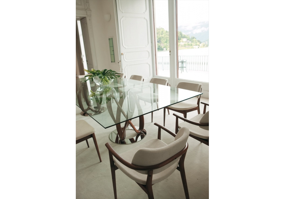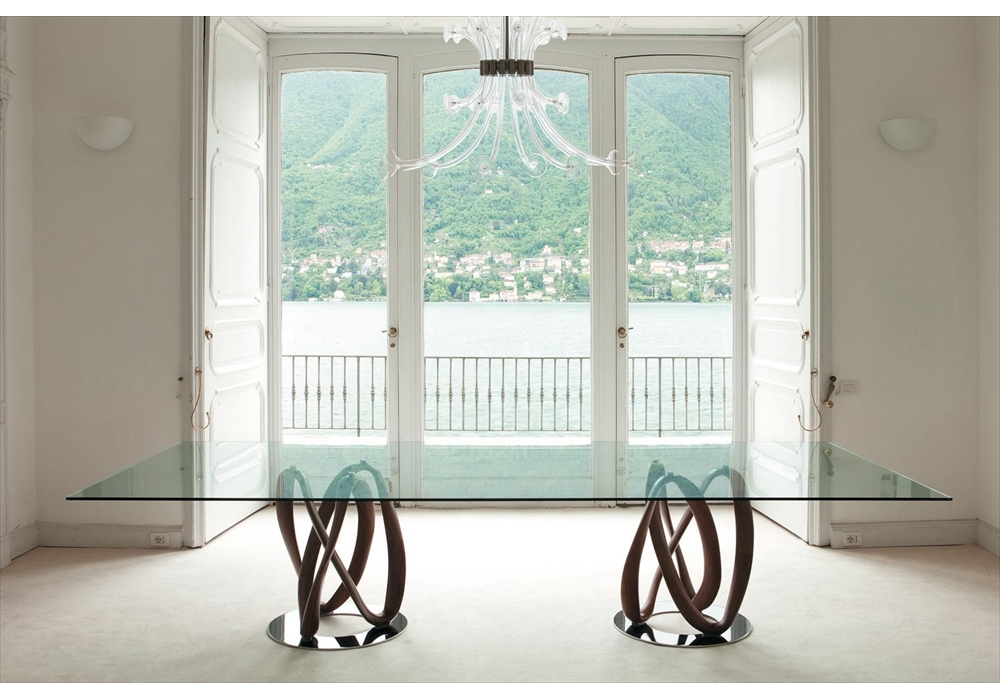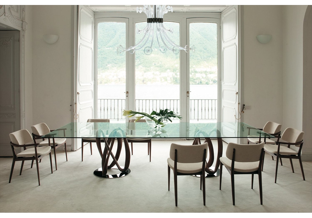 Infinity C designed by S. Bigi for Porada is a dining table with base in solid canaletta walnut or ashwood available in different finishes. Top in clear or smoked (thickness mm. 12). Base mounted on a metal ring. Available in different dimensions.