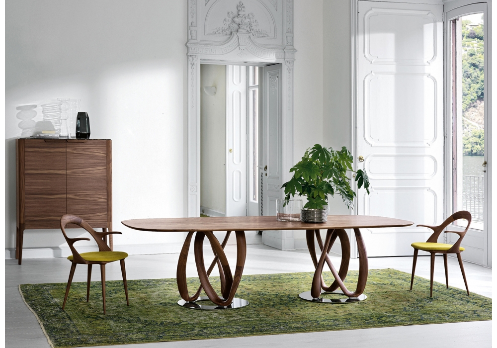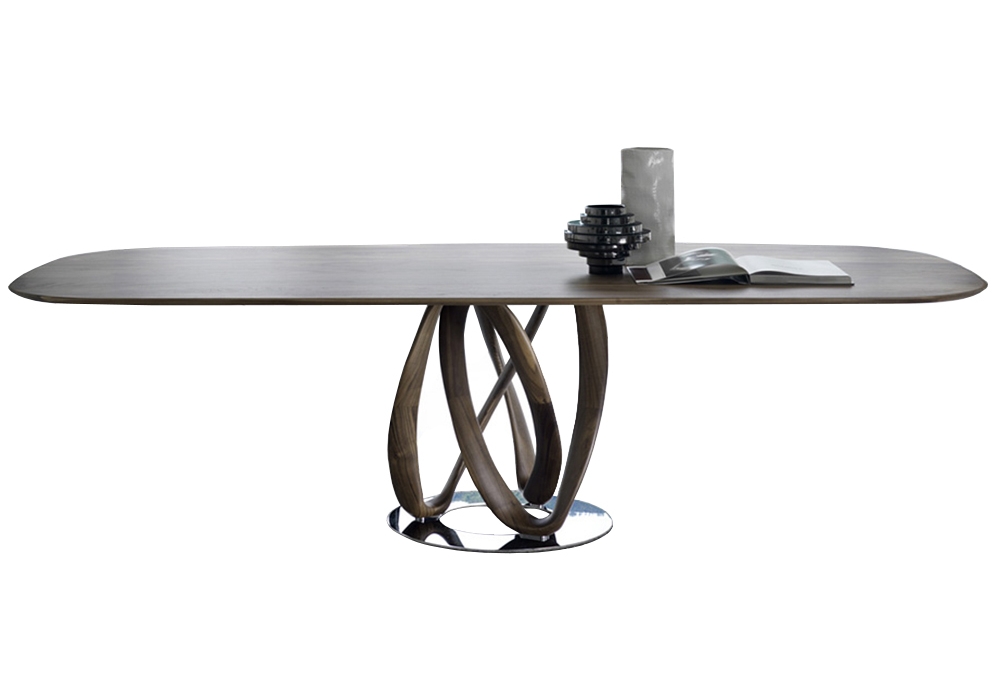 Infinity L designed by S. Bigi for Porada is a dining table in solid canaletta walnut or ashwood available in different finishes. Available in different dimensions, with one or two bases mounted on a metal ring.