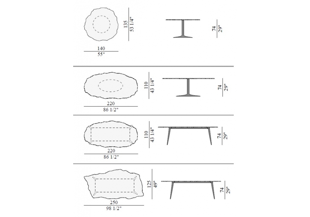 | Dimensions | • 140 x 135 x H 74 cm; • 220 x 110 x H 74 cm; • 220 x 110 x H 74 cm; • 250 x 125 x H 74 cm |