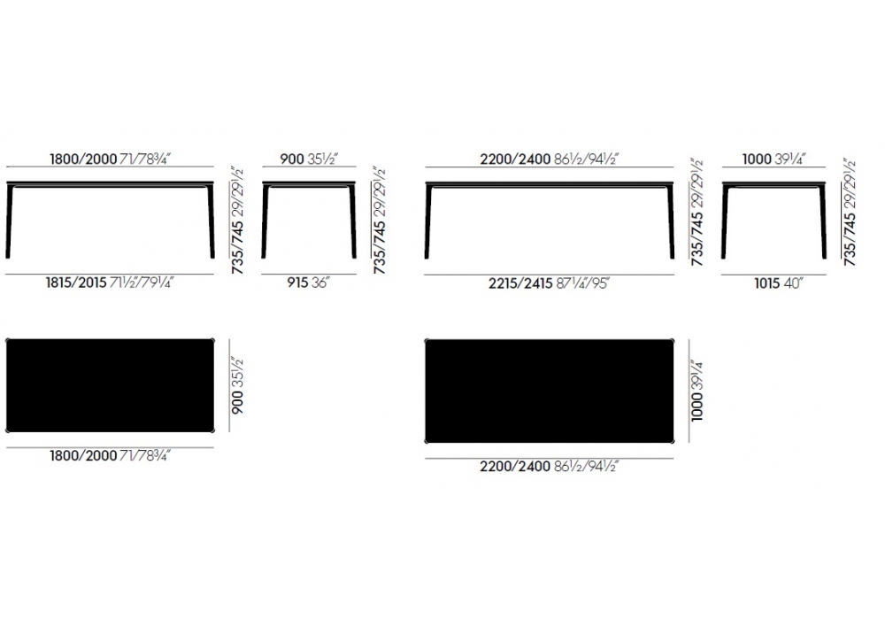 | Dimensions | 180 x 90 x H 74 cm; 200 x 90 x H 74 cm; 220 x 100 x H 74 cm; 240 x 100 x H 74 cm. |