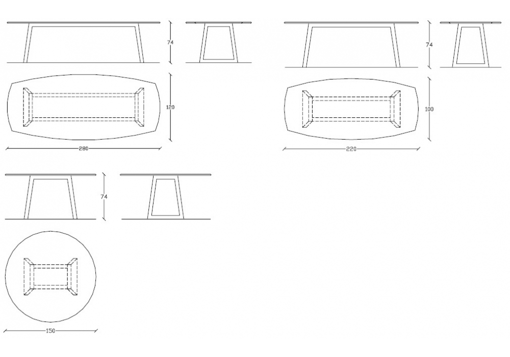 | Dimensions | L 220 x W 120 x H 74 cm; L 280 x W 120 x H 74 cm; Ø 150 x H 74 cm |